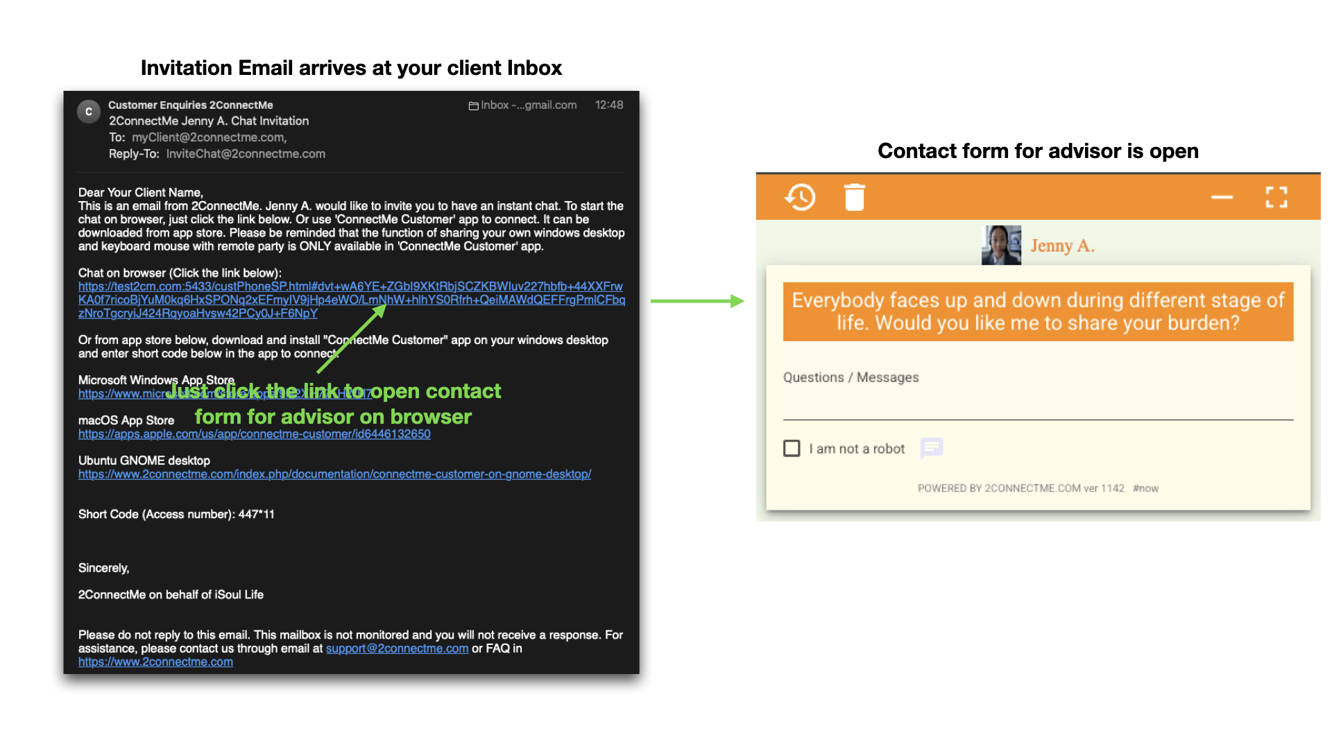 Client just clicks the Url link on the email to open contact form on any browser to reach advisor at any time.