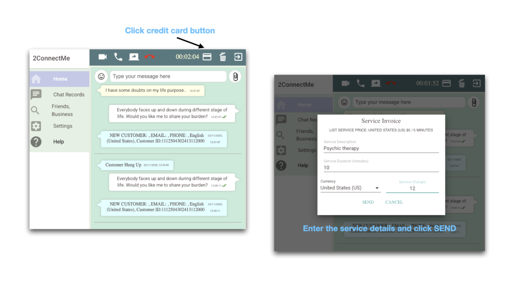 After successfully chat connection with customer, service staff advisor phone is with a “Credit Card” button. Such “Credit Card” button will triiger an invoice pop up to let service agent to input the details as follows.