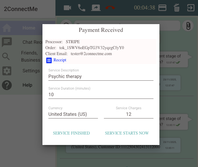 - Service Starts button which triggers timer starts to count down from the duration having been paid by the client.