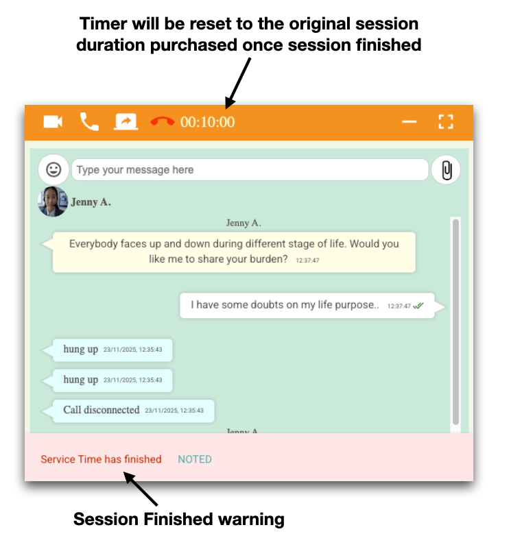 When the session time is running out, the timer will be reset to the original session duration purchased. Client may ask to buy a new session to continue the conversation immediately.